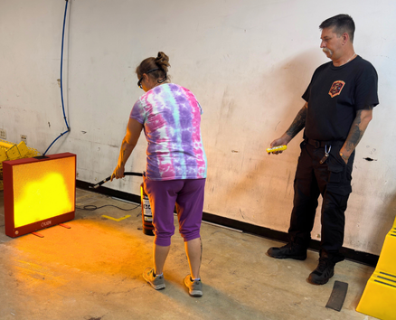 Inspector Mike Spencer led the session, using the department’s digital fire prop to safely simulate real fire conditions. The prop uses sensors and visuals to give participants a realistic, mess-free way to practice using an extinguisher—without flames, chemicals or cleanup.